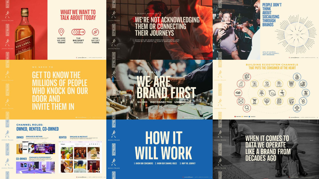 Dopple was asked to design a series of versatile pitch decks for AnalogFolk, featuring brands like Amazon Ads, Johnnie Walker, and Bayer. The decks needed to be visually engaging, clear, and adaptable, reflecting each brand’s identity while supporting client presentations.